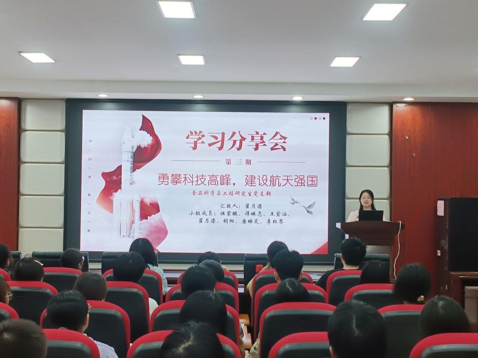 6月4日食品学院学生党支部在工三A320开展了“二十岁遇上二十大”党的二十大精神专题学习分享会第三期“勇攀科技高峰,建设航天强国”。食品学院学生70余人参加本次活动。