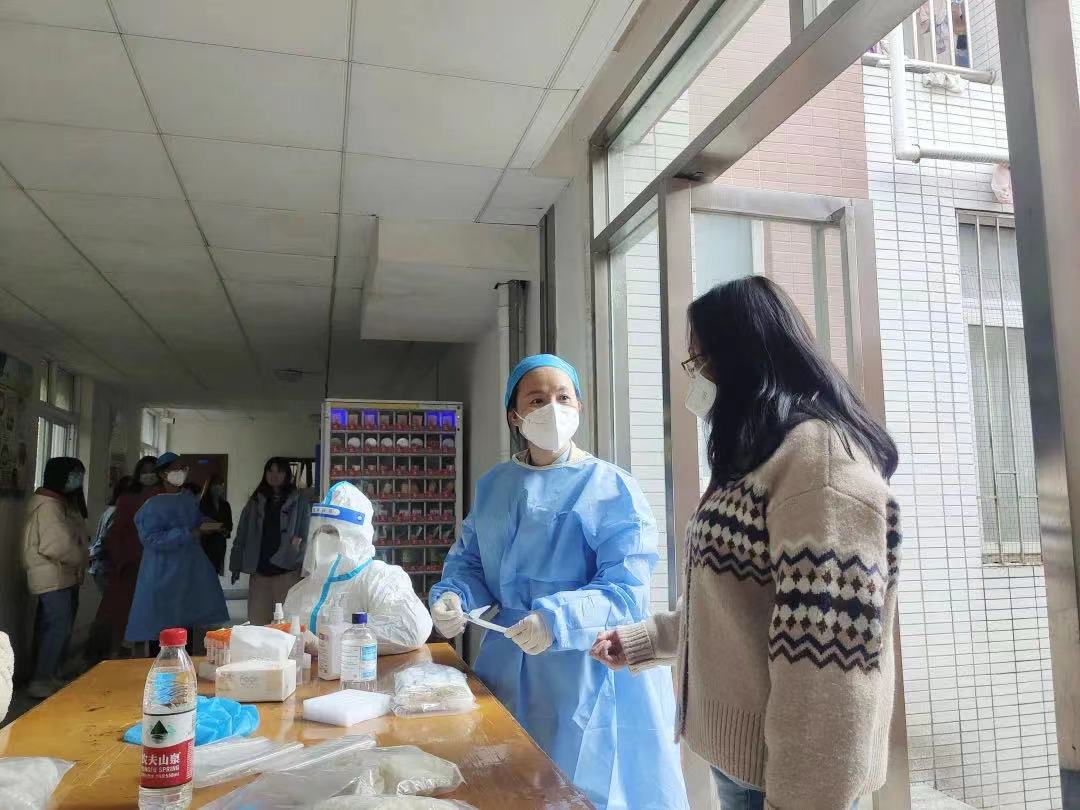 图3 盛灿梅老师在学生宿舍参加核酸检测志愿者工作