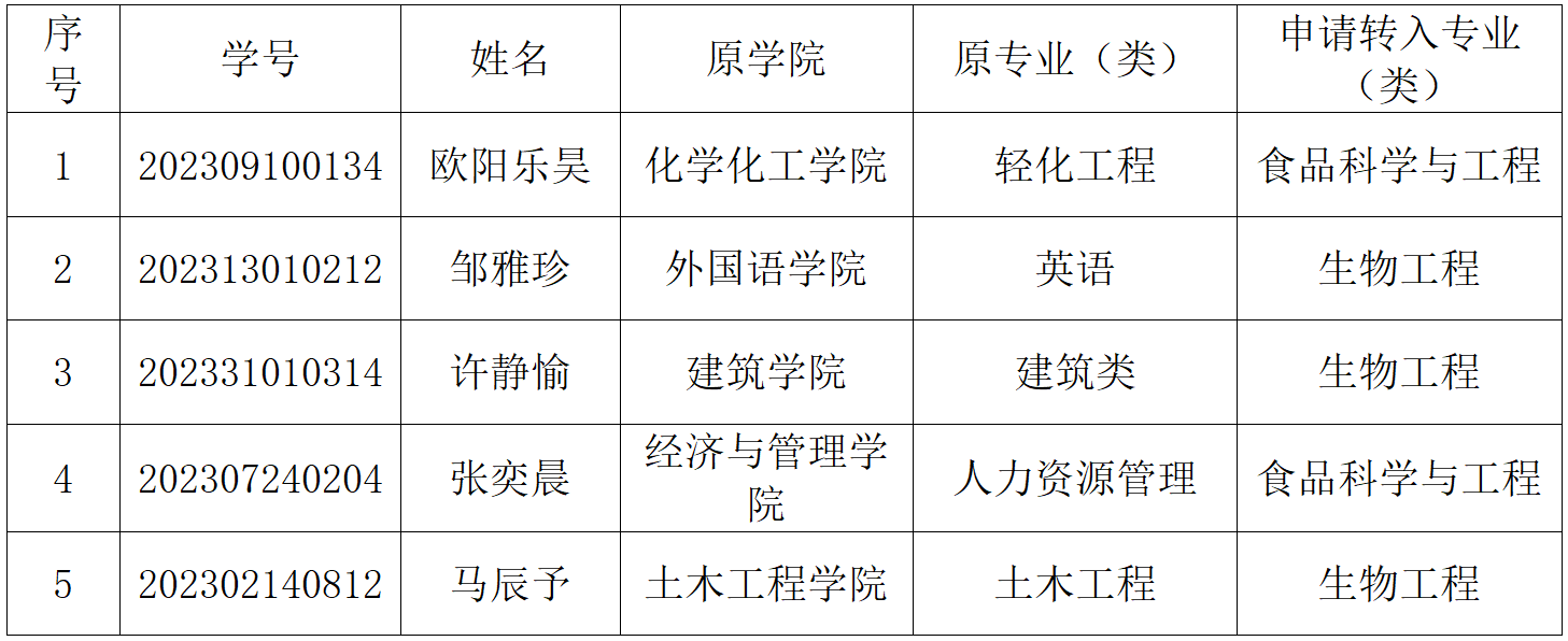 根据学校《437必赢会员中心本科生转专业管理办法》和《食品与生物工程学院2023级本科生转专业工作方案》的相关规定,经学生个人申请,学院转专业工作小组考核,现将本院2023级本科生转专业拟转入名单进行公示,公示期为2024年3月27日-3月29日15:00。如有异议,可在公示期内以书面形式向食品学院教务办实名反映,电话:0731-85258727。