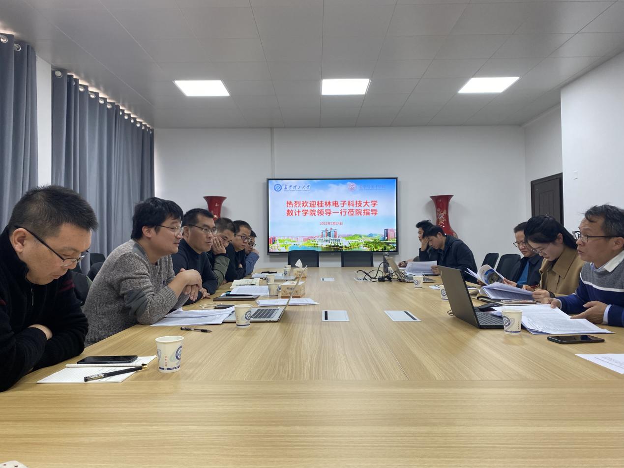 鉴于我院近几年在专业建设、人才培养、课程建设、公共数学教学、学科竞赛等方面取得显著成效, 2023年2月24日上午,桂林电子科技大学数计学院副院长吴孙勇带领考察组赴我院交流调研。为进一步完善两院人才培养方案、公共数学改革,提升教学管理水平,我院党委书记邓崛峰、党委副书记郑忠辉、副院长仝青山、副院长李姣率领系(部)负责人与以吴孙勇副院长为首的代表团于437必赢会员中心理科楼A-410召开交流调研会议。