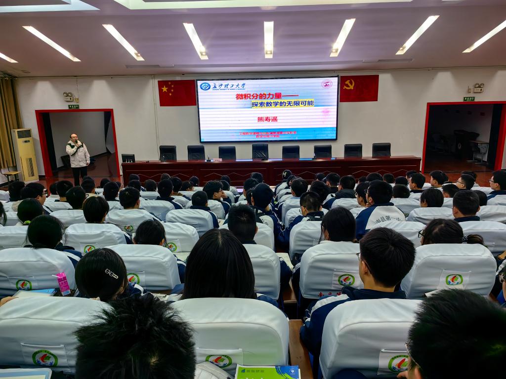 座谈会之后,熊寿遥和郑忠辉分别为两所中学的师生开展了数学科普知识讲座和招生宣传。熊寿遥以“微积分的力量——探索数学的无限可能”为题给南县第一中学400余名师生作了一场数学科普知识讲座,他从微积分是谁、微积分从哪里来、微积分到哪里去等方面详细介绍了微积分的定义、产生背景、发展进程和应用场景,他通过生动的案例和形象的比喻,让师生们深刻感受到了微积分在科学研究、工程技术以及经济金融等领域的广泛应用和巨大价值。