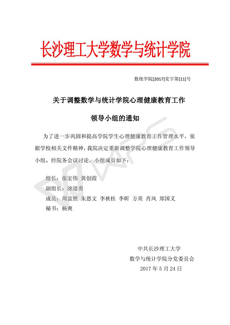 关于调整数学与统计学院心理健康教育工作领导小组的通知