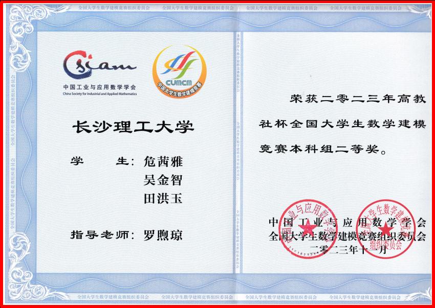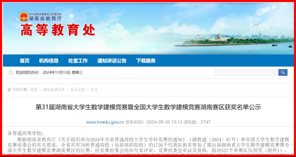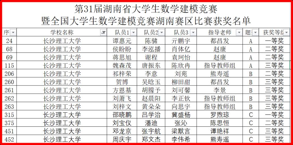 同时,近日,湖南省教育厅高等教育处发布了“第31届湖南省大学生数学建模竞赛暨全国大学生数学建模竞赛湖南赛区获奖名单公示”的通知,必赢官网在第31届湖南省大学生数学建模竞赛暨全国大学生数学建模竞赛湖南赛区的比赛中获得一等奖2项,二等奖4项,三等奖7项。