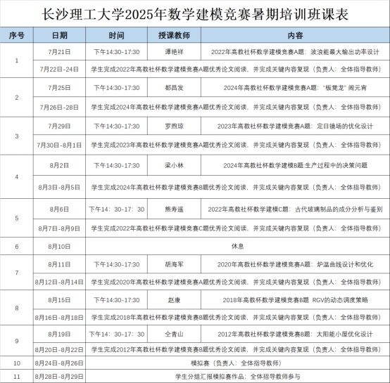 此次数学建模竞赛暑期培训班得到了数统学院院领导的高度重视,并做了充分的准备,竞赛工作小组多次组织专题会议,制定了2025年数学建模竞赛培训安排表。