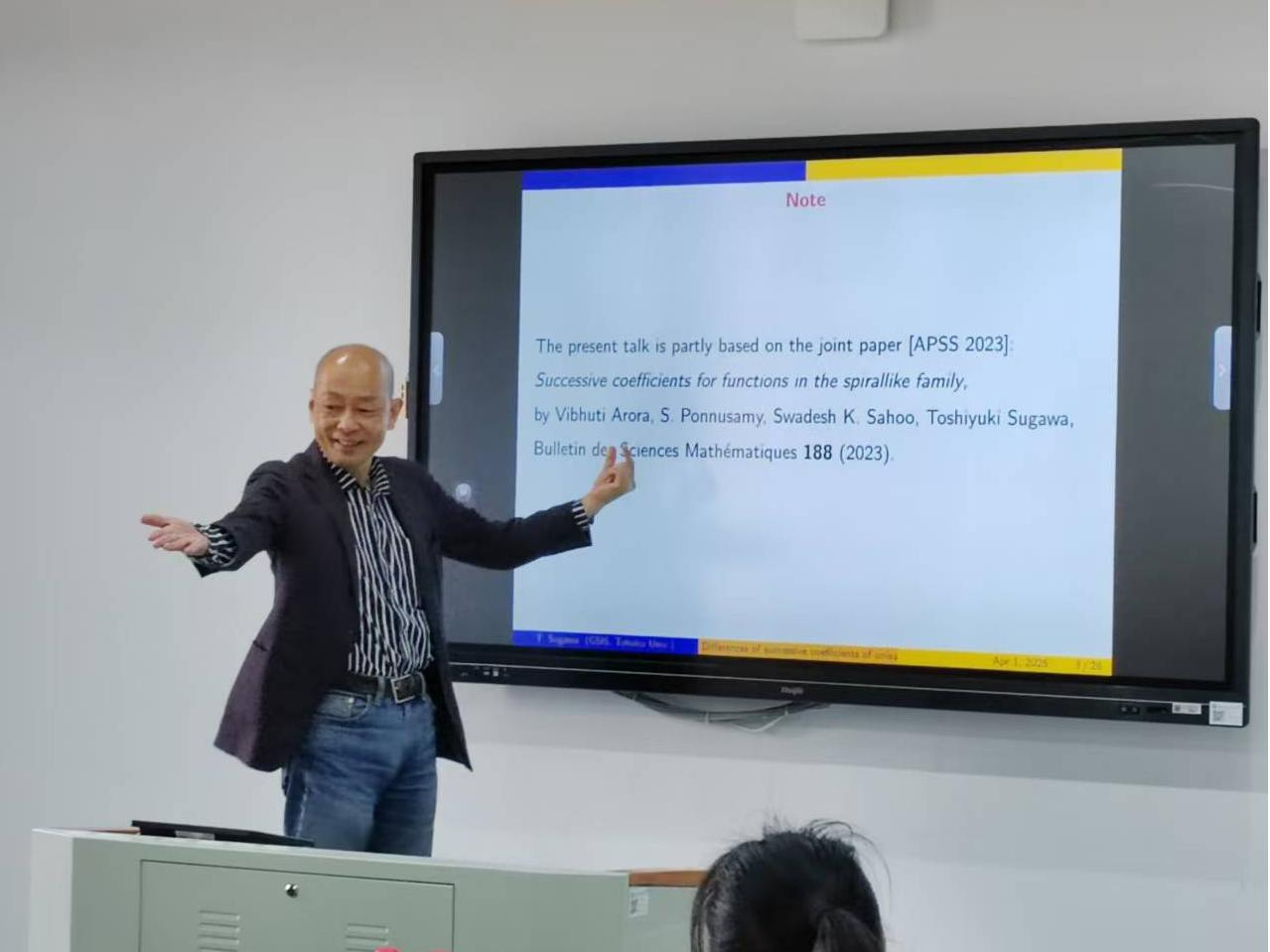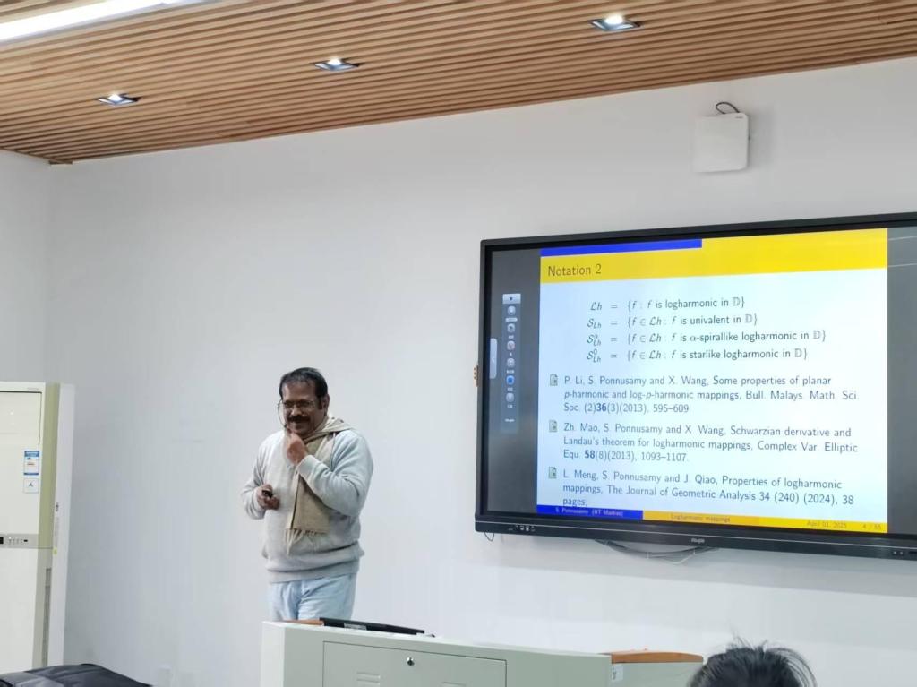 Sugawa教授和Ponnusamy教授分别作题为《Successive coefficients for functions in the spirallike family》、《Certain Properties of Logharmonic mappings》的报告。报告结束后,与会学者、学生与Sugawa教授、Ponnusamy教授进行了深入的讨论,大家纷纷表示受益匪浅。此次学术活动是学院推动科研国际合作的重要举措,为师生提供了与国际顶尖学者面对面交流的宝贵机会,将进一步激发学术创新活力,助力学科发展。