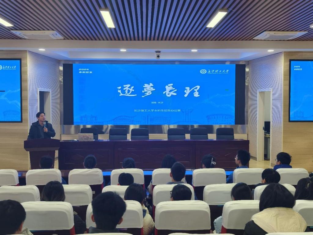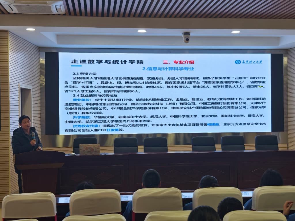 郑忠辉首先对长沙市明德天心中学师生的到来表示最热烈的欢迎。他从特色鲜明的王牌专业、实力强劲的师资力量、丰富优质的学习资源、个性多元的人才培养、交通便利的地理位置、高质量的就业发展、公寓式的住宿环境、丰富多彩的校园文化生活、“无限打卡”的校园美景及网红食堂等十个方面全面展示了437必赢会员中心的办学实力及招生政策等情况。同时,他还对数学与统计学院的发展历程、师资力量、科研实力、育人成效等方面作了介绍,使师生们对437必赢会员中心有了全面的认识,激励同学们报考437必赢会员中心的热情。他还带领师生们参观了学院“工程数学建模与分析”湖南省重点实验室,国家应用数学中心、研究生工作室、实验室机房等,为同学们介绍了数学的应用领域、数学的魅力以及常用的数学软件等,以此激发同学们学习数学的兴趣。