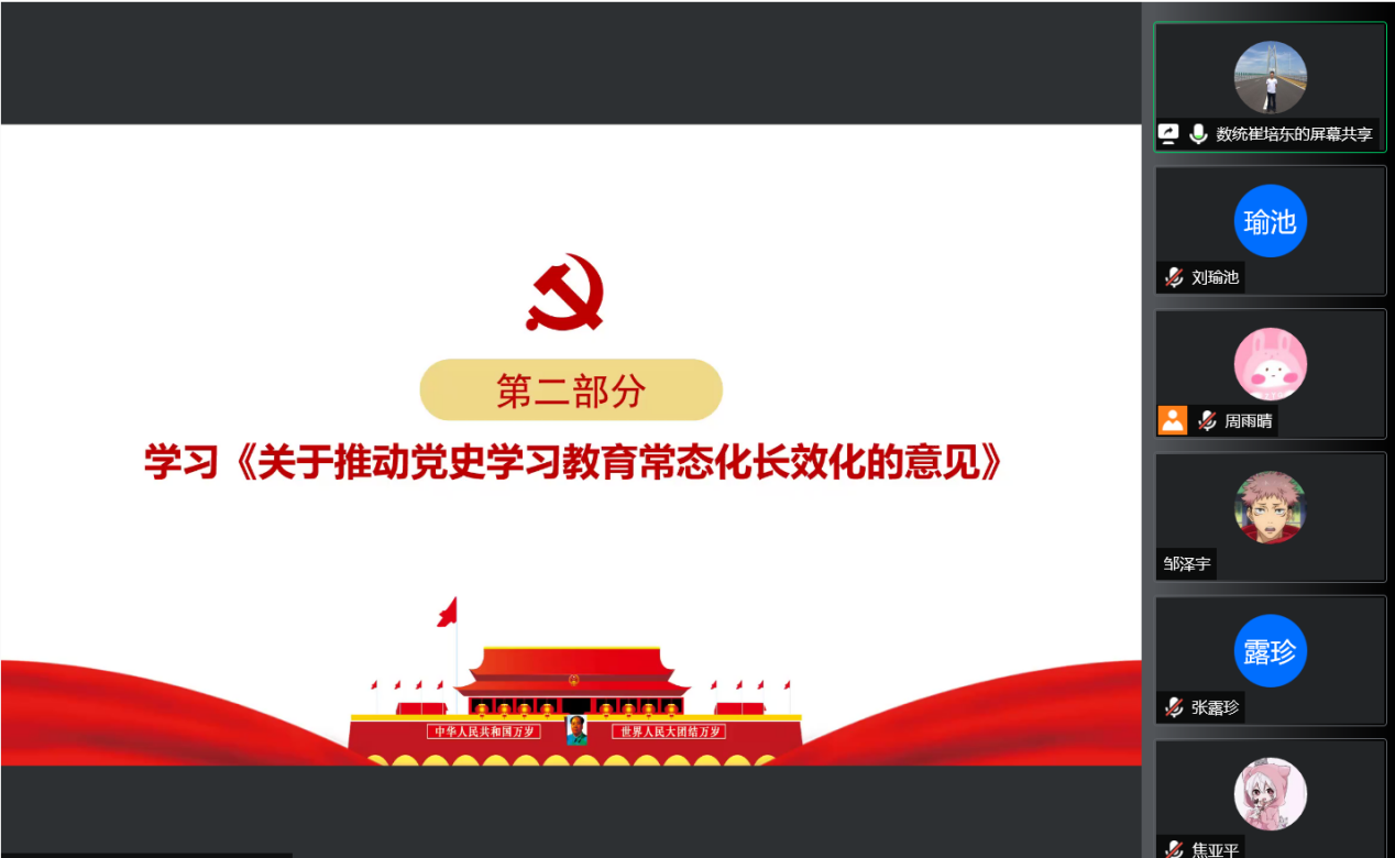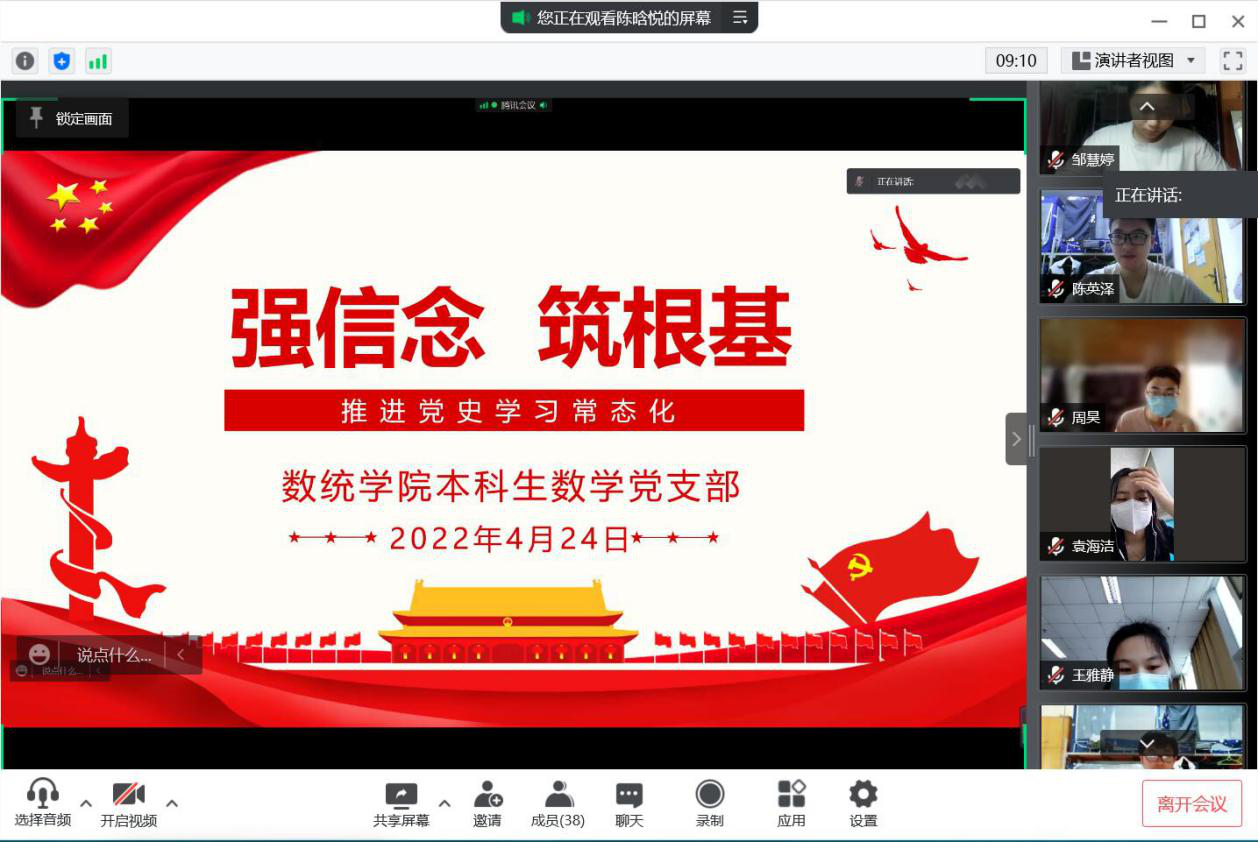 为进一步推动全党深入学习贯彻习近平新时代中国特色社会主义思想和党的十九届六中全会精神,聚焦迎接学习贯彻党的二十大这条主线,持续加强意识形态,增进团结、增加信心、增强斗志,更加坚定自觉地牢记初心使命。数统学院本科生各党支部于4月下旬举行“强信念、筑根基”主题党日活动。