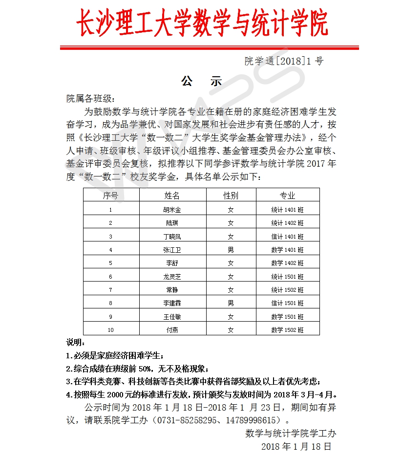 数学与统计学院2017年度“数一数二”校友奖学金获奖学生名单公示