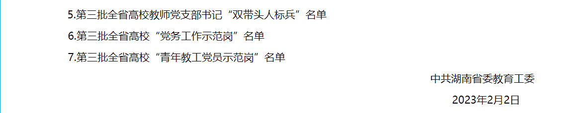 2022年12月,根据湖南省委教育工委发布的《关于做好全省高校党组织“对标争先”建设计划第三批项目评选和高校“双带头人”教师党支部书记工作室建设工作的通知》(湘教工委通〔2022〕23号)部署要求,土木工程学院党委积极申报,经学校评审推荐,中共湖南省委教育工委资格审查、专家评审、评委会评议和工委会审定,确定了第三批全省高校党建工作示范高校7所、标杆院系51个、样板支部100个、“双带头人”教师党支部书记工作室培育创建单位11个、“双带头人”标兵102名、党务工作示范岗102个、青年教工党员示范岗101个。