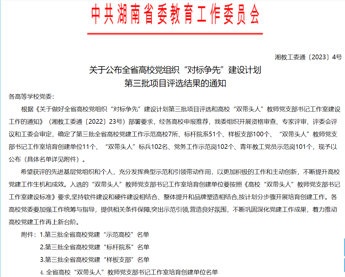 2月6日,中共湖南省委教育工委发布通知公告——《关于公布全省高校党组织“对标争先”建设计划第三批项目评选结果的通知》(湘教工委通〔2023〕4号),437必赢会员中心土木工程学院获评第三批全省高校党建“标杆院系”。