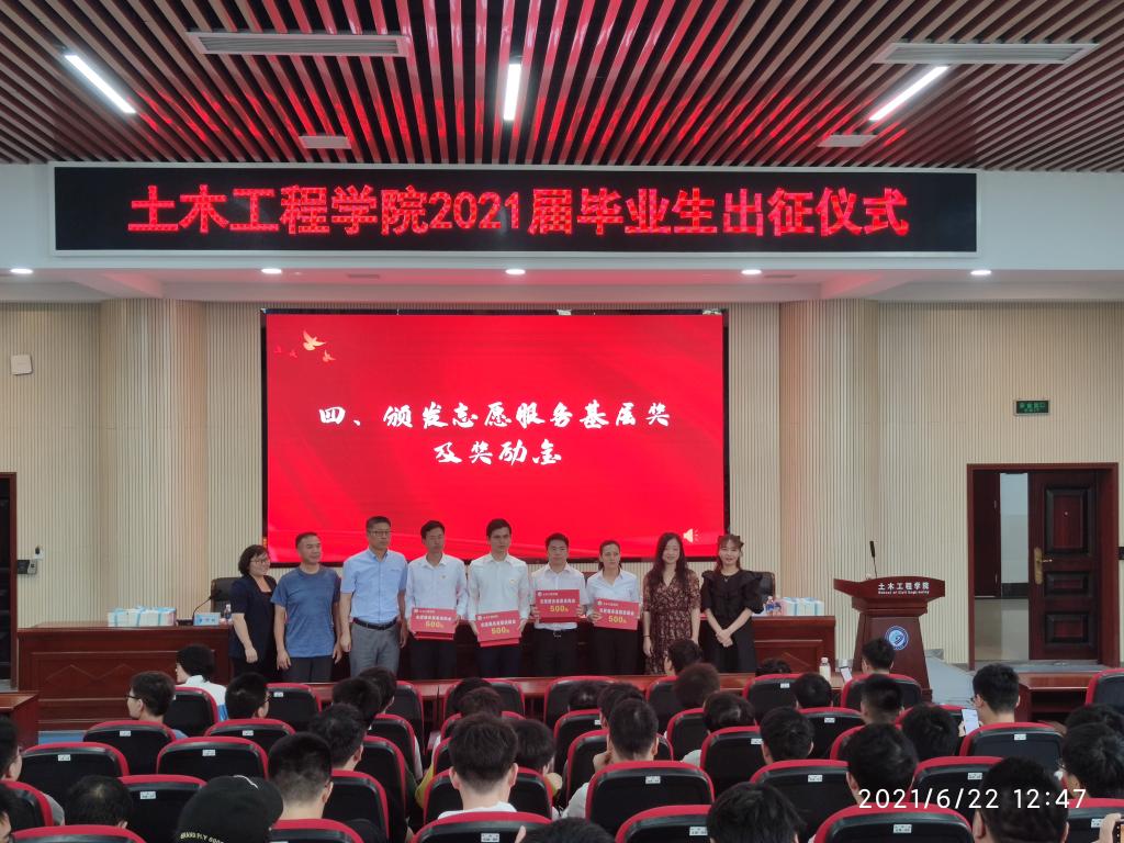 随后,学校学生工作部(处)副部(处)长闾兰、招生就业处副处长李娜共同为2021届毕业生代表颁发了志愿服务基层奖及奖励金。勉励广大土木青年勇于到条件艰苦的基层、国家建设的一线、项目攻关的前沿,经受锻炼,增长才干,扎根人民,服务基层,建设祖国。