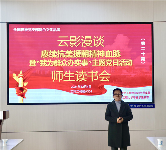 12月4日下午,力学系师生于工科二号楼学生发展中心,以“赓续抗美援朝精神血脉”为主题,开展全国样板党支部特色文化品牌活动之“云影漫谈”师生读书会第20期。学科建设与发展规划处副处长赵冰、学院党委副书记黄阿明、副院长付果,力学系师生党支部成员及50余名力学系学生代表参加了此次读书会。
