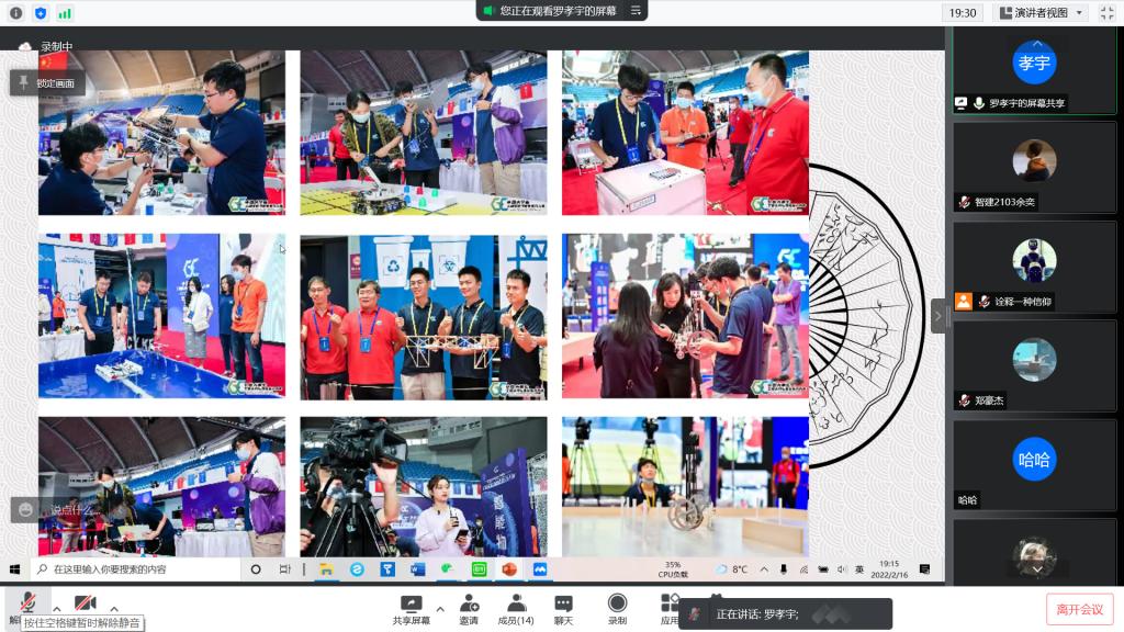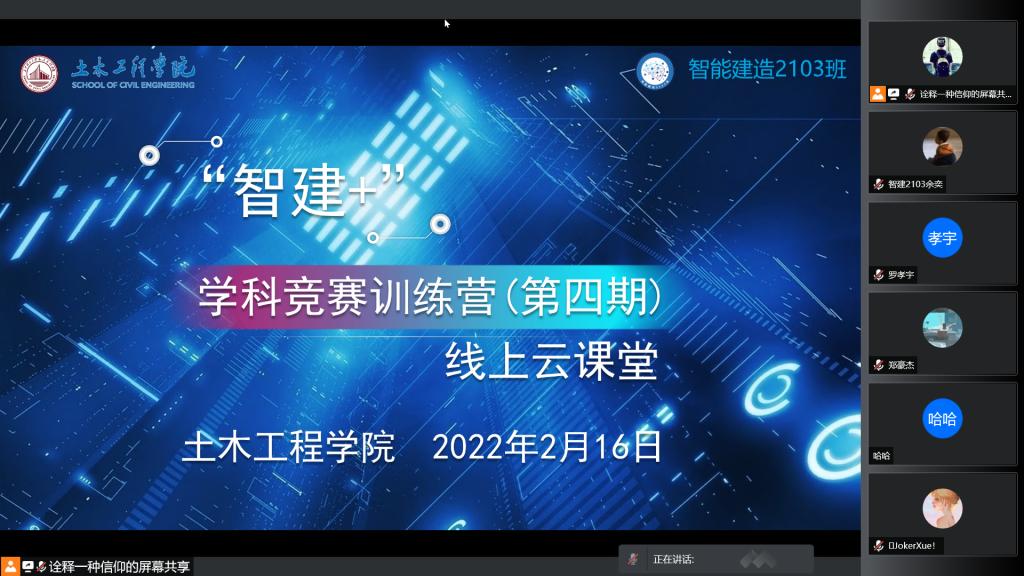 为促进学生对中国大学生工程实践与创新能力大赛的了解,进一步提升学生综合素质,2月16日晚,土木工程学院智能建造2103班开展“智建+”学科竞赛训练营第四期线上云堂课。中国大学生工程实践与创新能力大赛金奖获得者罗孝宇应邀主讲。智能建造2103班班主任李小军老师,下班干部田泽东及来自全院20余位学员参加培训,班级团支书蒋志鹏主持会议。