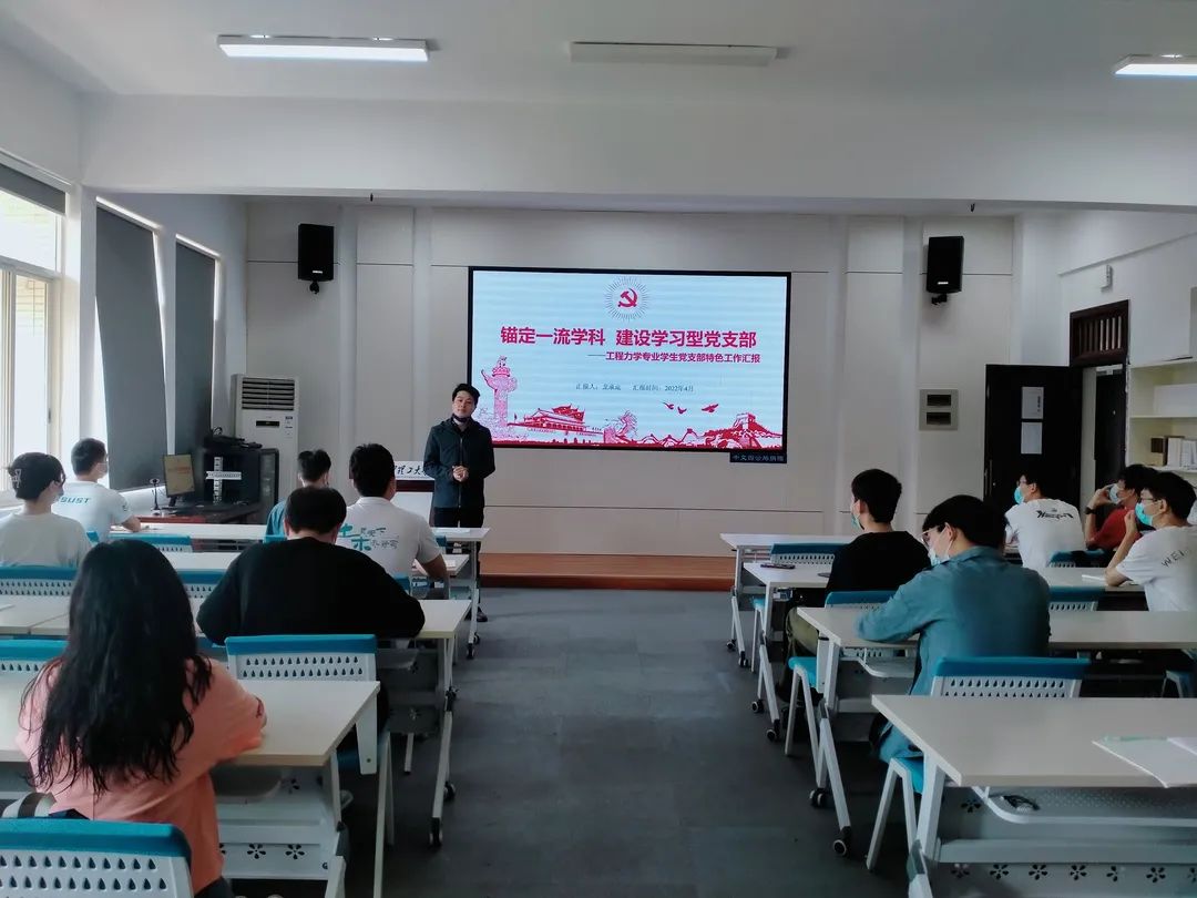 会上,龙承运围绕支部建设背景、建设举措和工作目标三个方面做了《锚定一流专业,建设学习型党支部》的工作汇报。他通过分析工程力学专业学生往届毕业率、考研录取率和转专业率,阐述了工程力学专业具有专业难、学生对专业不自信等特点。结合工程力学专业学生特点、支部实际情况和前期调研结果,龙承运提出了锚定工程力学国家一流专业建设点,建设学习型特色党支部。他基于主动自学、全员共学和志愿助学三维学习理念,重点介绍了支部特色工作建设举措,构建起了支部3×3学习型党支部建设模式。