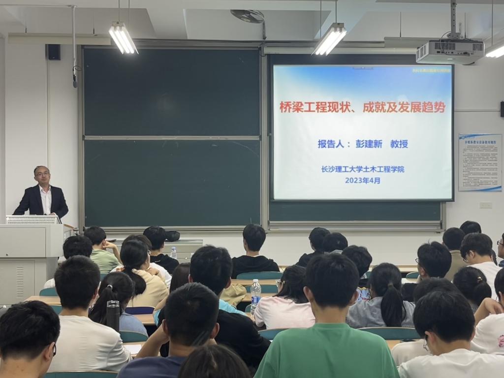 讲座伊始,彭建新以古代桥梁萌芽阶段为切入点,由古及今,带领学生们一览中国桥梁发展历程,并从数量增多,成果显著,服役条件等方面介绍了我国现代桥梁建设现状。接着,他对混凝土桥梁主要病害进行深入剖析与讲解,并由病害问题引出桥梁整体检测技术与桥梁无损检测技术的应用。他指出利用智能设备可完成病害检查,有利于提高效率,降低风险。最后,他从高性能材料的运用,桥梁设计软件的开发,先进工程装备的设计,桥梁智能监测与养护等领域的进步展现了桥梁工程日益发展的趋势。