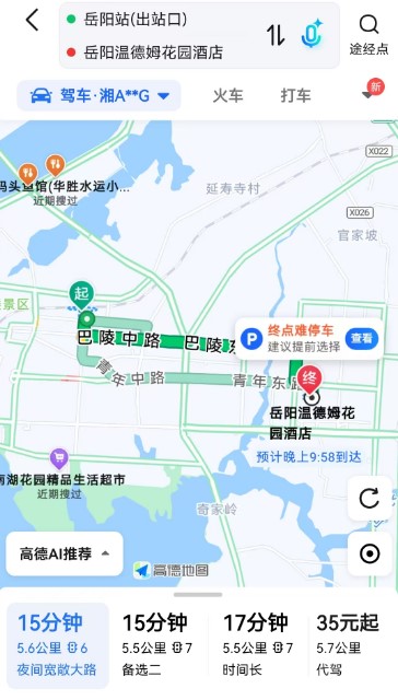 岳阳三荷机场→岳阳温德姆花园酒店:驾车约15km,用时约20min,打车约36元。
