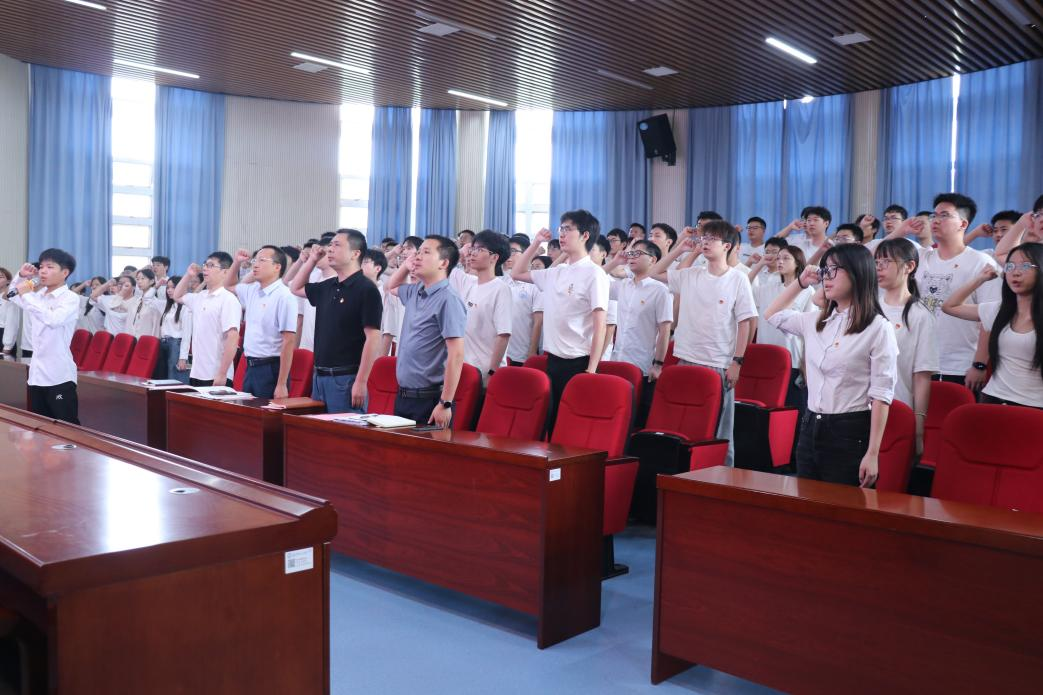 吴振华发表总结讲话指出本次大会对增强党员意识、提升思想水平及推动学生党建工作具有重要意义,传达了党组织对学生党员的深切关怀与殷切期望,并勉励大家牢记使命、积极进取,投身学习与实践,奉献青春力量。最后,在学生党员代表领誓下,全体与会党员面对党旗庄严宣誓,现场气氛庄重热烈。