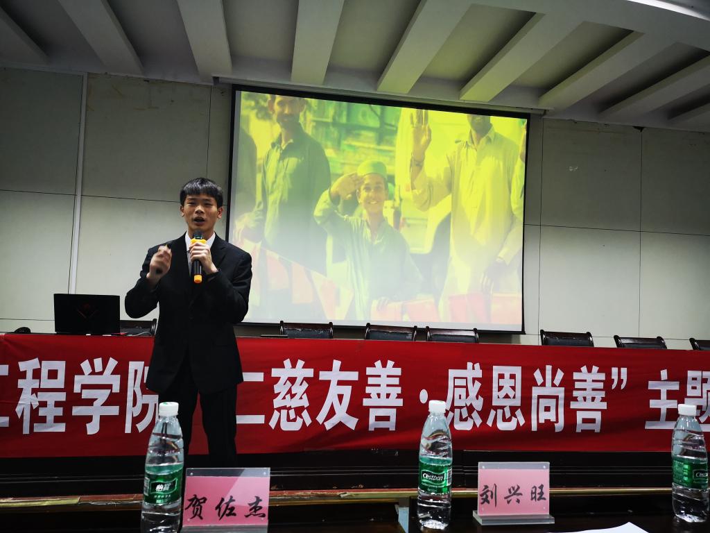 刘玖铱等十位参赛选手围绕“仁慈友善•感恩尚善”主题从不同的角度切入,进行了精彩的演讲。土木1806班谢承禹带来的《感恩路上的友谊之花》从中国与巴基斯坦“与君初相见,犹如故人归”的情谊展开,从七十年代我国对巴基斯坦的援助,到后来巴基斯坦战火纷飞也要护住中国人。观众们在沉思的同时,分分点头表示赞同。