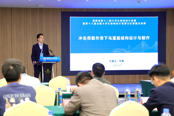 付果向参会高校代表介绍了湖南省第十二届大学生结构设计竞赛题目,并就比赛模型的制作、荷载加载方式、计分标准等进行了细致的说明,同时耐心地解答了相关代表提出的问题。最后,付果还宣布了下一届湖南省大学生结构竞赛的承办高校。