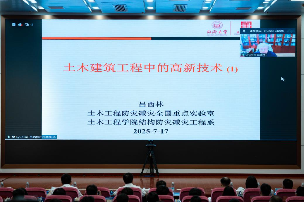 开班仪式结束后,学术报告环节正式拉开帷幕。中国工程院院士、同济大学教授吕西林带来题为《土木建筑工程中的高新技术》的报告。吕西林院士长期从事结构抗震领域的研究,在建筑结构抗震及减震等方面成果卓著。在此次报告中,他凭借深厚的专业积淀与丰富的实践经验,为在场师生深入浅出地剖析土木工程、建筑设计与基础设施建设领域的前沿知识与实践成果,分享行业前沿思考,拓宽了师生们在土木建筑工程领域的视野,激发了大家深入探索的热情。