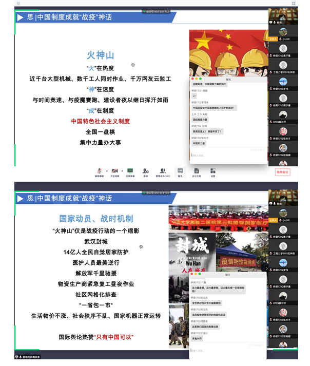老师们的讲课在学生中引发强烈共鸣,聊天框和自由互动反响热烈。桥梁1704班林栋平时安静内敛,在课堂互动环节他却主动为自己争取到发言的机会:“我爸爸是当地卫生计生综合监督执法局的一名普通党员……他已经连续奋战40多天,我很担心他,更为他骄傲。关键时刻冲得上去,危难关头豁得出来,我想这就是共产党人的党性。我们正是因为千千万万他们这样的人才被保护得很好……我也希望自己向爸爸学习,成为一名敢担当勇冲锋的共产党员。”同班同学曹宇佳打开视频发言时,眼眶中闪烁着泪水,他动情地说:“如果奇迹有颜色,我想那一定是中国红!”