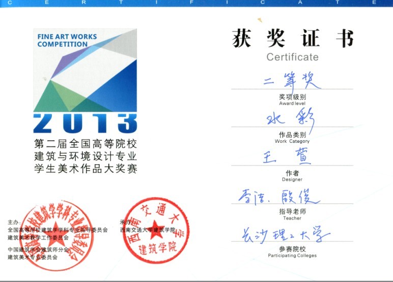 2013年5月17—19日,在西南交通大学召开的第十二届全国高等院校建筑与环境艺术设计专业美术教学研讨会上又传来喜讯,必赢官网土建学院城市规划系学生王萱同学的作品喜获水彩类银奖。这是由全国高等学校建筑学科专业指导委员会、中国建筑学会建筑师分会建筑美术专业委员会以及西南交通大学联合组织和承办的第二届全国高等院校建筑美术作品比赛,规模比第一次更大,覆盖面更广,水彩类银奖作品全国只有6件。另,必赢官网学生官志、蒋高达、吴思文、姚乐、周旭、徐航、邢睿、付蓝彤、罗璇、曹若冷、高雨时、史华熙、徐俊虎、罗琪、王彪、严阳等同学的作品入选编入由中国建筑工业出版社出版的《学生作品集》,对这些同学表示祝贺!