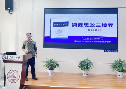 申志彬教授以王国维《人间词话》中人生、治学三境界为引子,深入浅出展开讲座,以《固体力学原理》思政建设为例,提出课程思政建设的三境界。境界一: “望尽天涯路”,要做到挖掘足够多的思政元素, 将中国古代力学成就、力学家光辉事迹等插入课程,将力学原理和世界观、人生观相类比融入课程,挖掘力学蕴含的思政元素,提炼科学精神、工匠精神。境界二: “为伊消得人憔悴”, 教员须把教书育人放首位,言传身教,身正为范,燃烧自己,照亮学生。境界三:“ 那人却在灯火阑珊处”,学生思政即影响学生、唤醒学生,鼓励让学生影响学生,让所有学生都有感悟、有收获。