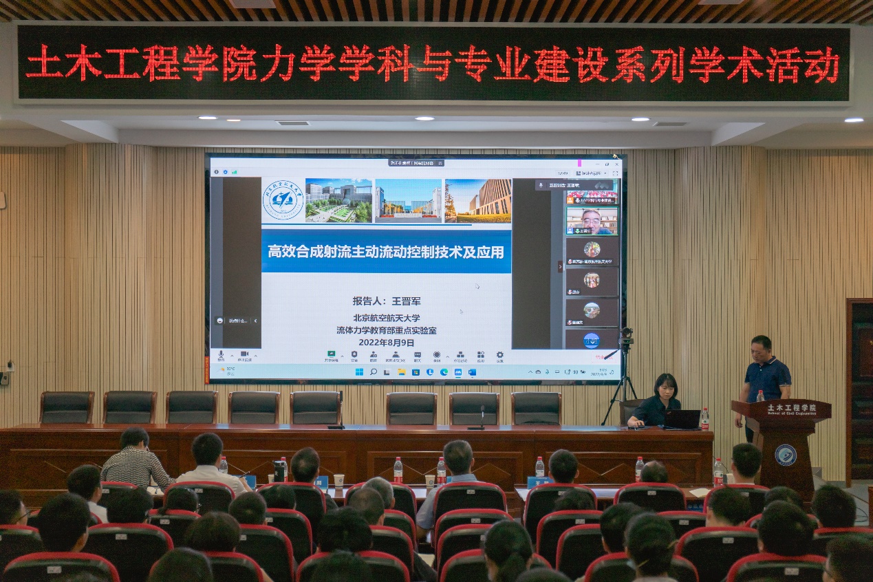 8月9日上午9时,在必赢官网工程力学国家一流专业与力学学科建设发展研讨会上,国家杰出青年科学基金获得者、教育部“长江学者”特聘教授、国家自然科学基金创新研究群体学术带头人、北京航空航天大学航空科学与工程学院王晋军教授应邀作了题为《高效合成射流主动控制技术及应用》的学术报告。报告由土木工程学院副院长韩艳教授主持,土木工程学院院长王磊教授、哈尔滨工业大学王超教授、力学系全体教师和100余位研究生线下参加了此次报告,部分专家、学者线上聆听了此次报告。