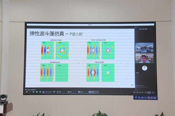 报告会上,刘晓宁以超材料在波动控制中的应用为背景,详细介绍了他在手性超材料、弹性波/声波变换理论和五模超材料方面的研究工作和进展。刘晓宁深入浅出地讲解了如何利用二维手性弹性材料激发旋转平移耦合共振实现负密度、负模量的弹性“双负”超材料;利用高阶弹性介质力学描述二维手性结构;利用旋转谐振打破弹性张量的小对称性,进而实现弹性波隐身斗篷;利用五模材料调控宽低频声波。