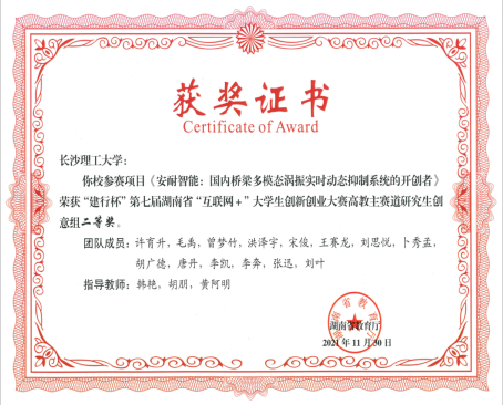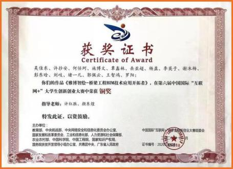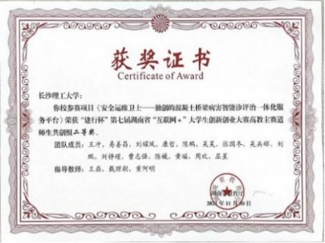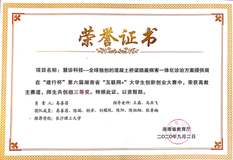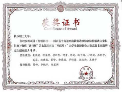 2020年第六届中国国际"互联网+创新创业大赛”中获铜奖;在湖南省第六届"互联网+创新创业大赛”中获二等奖一项,三等奖2