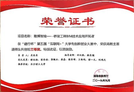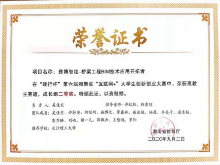 2019年在湖南省第五届"互联网+创新创业大赛”中获二等奖。