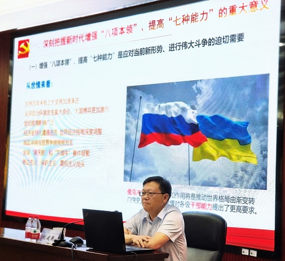 刘建民首先阐述了习近平总书记关于加强干部队伍能力建设重要论述。着重解读了十九大报告提出的“学习本领、政治领导本领以及改革创新本领”等八项本领;深刻阐释了2020年习近平总书记在中央党校干部培训班开班仪式上提出的“政治能力、调查研究能力以及科学决策能力”等七种能力。从深刻把握的重大意义、全面理解的内涵要求、决胜建成“百强”大学的实践中提高本领和能力三大方面进行了系统全面的论述,从世情、国情和党情上高度进行了梳理和论证,分析了其中的内在逻辑,深刻指出了全面提高干部能力,是推动新时代事业发展的必然要求。