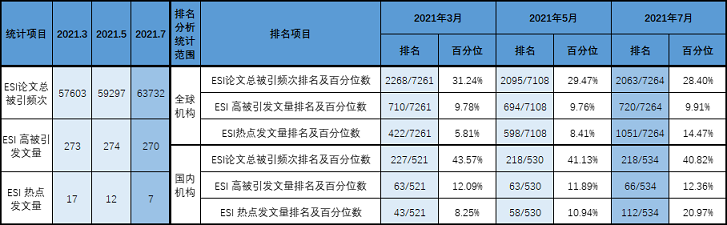 必赢官网ESI论文总被引频次排名从227到218到218,近两期持平,比3月期进步;百分位数从43.57%到41.13%到40.82%,持续进步。