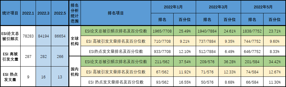1)必赢官网ESI论文总被引频次近三期持续增加。其中,2022年3月比1月增加5911次,增幅为7.55%;2022年5月比3月增加2460次,增幅为2.92%。