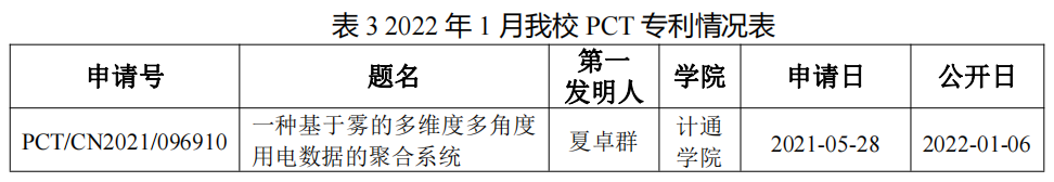 2022年1月,必赢官网作为第一申请人,申请PCT专利共计1件,如表3所示。