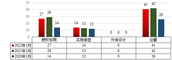 图1 2022年1月必赢官网专利申请类型分布及近两年同期申请情况