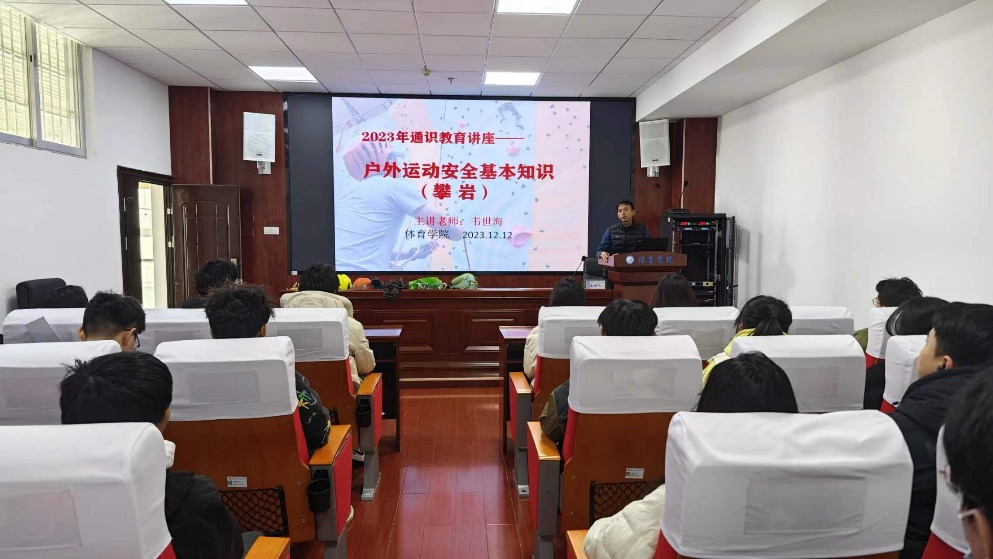 2023年12月12日,由体育学院韦世海老师主讲的“户外运动安全基本知识”在云塘体育馆学术报告厅举行。来自各学院爱好户外运动的近60名同学参加本次讲座。本次讲座主要为同学们讲解户外运动安全第一的理念,从户外运动的分类,以及全面的介绍户外运动中有可能遇到的危险因素,并给出相应的解决办法。通过本次讲座,使同学们充分感受到户外运动魅力,同时也学会在到意外发生时怎样做好应急处理。