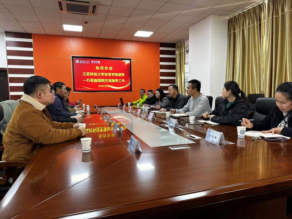 2025年1月10日,江苏科技大学体育学院副院长王长征、赵长征以及场馆中心主任杨威一行莅临437必赢会员中心体育学院,进行交流指导活动。437必赢会员中心体育学院党总支书记李龙、副院长潘红玲、谭志华及相关人员热情接待了来访嘉宾,并积极参与了交流讨论。