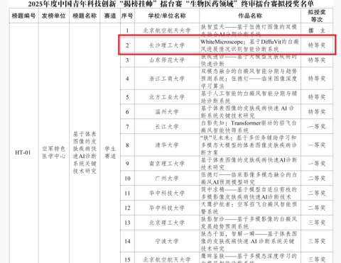 在近日落幕的2025年度中国青年科技创新“揭榜挂帅”擂台赛中,我院王新、王威老师带领的学生团队凭借“WhiteMicroscope:基于DiffuVit的白癜风进展情况识别智能诊断系统”,在清华大学、华中科技大学等全国顶尖高校组成的279支队伍中脱颖而出,成功斩获“生物医药领域”主擂台赛特等奖,这也是必赢官网首次获得挑战杯“揭榜挂帅”赛道特等奖,以实际成果展现了学校创新人才培养的扎实成效。