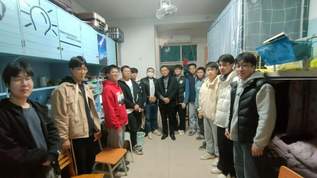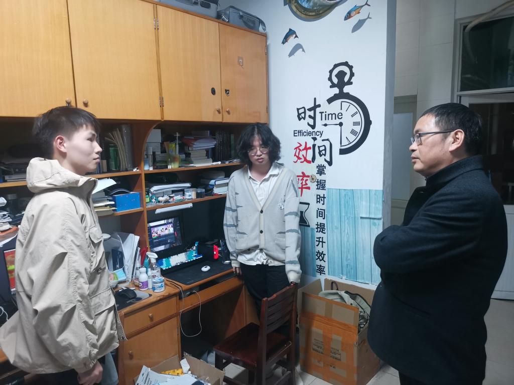 张书记来到20级人工智能专业的学生宿舍,他亲切的询问大家的生活情况、现在课程的学习情况以及今后的考研想法并给出相关建议和看法。同学们都积极说出自己的想法,大部分表示有考研的意愿,并且有的已经想好了目标学校和方向,张书记鼓励大家做好学业规划,并提醒同学们注意冬季寝室消防安全,做好个人疫情防控,非必要不外出。