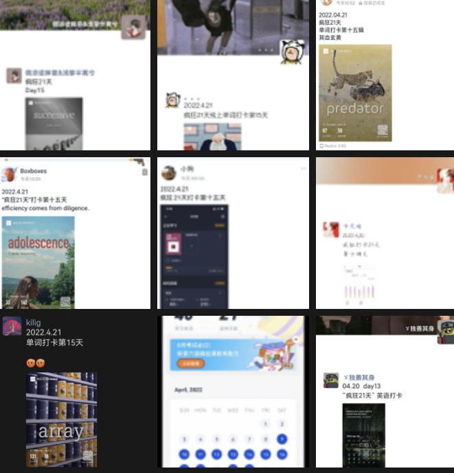 “疯狂21天”打卡活动分为考研和六级两个赛道,同学们根据自己的学习情况选择不同的赛道。英语单词打卡活动一经开展便得到了同学们的积极响应,大家纷纷踊跃报名,迫不及待地参与其中。在单词打卡的过程中,同学们每天都按质按量地上传打卡的英语单词。大家不是“三分钟”热度,而是把每天都当做全新的挑战,一天天过去,随着练习的单词数目逐渐积少成多,掌握的单词数目越来越丰富,积土成山,积水成渊,每天单词多掌握一点,离梦想的距离就近一点。大家一起打卡,互相督促,互相进步,学习氛围十分浓厚,最后有许多同学都成功地完成了打卡的计划。