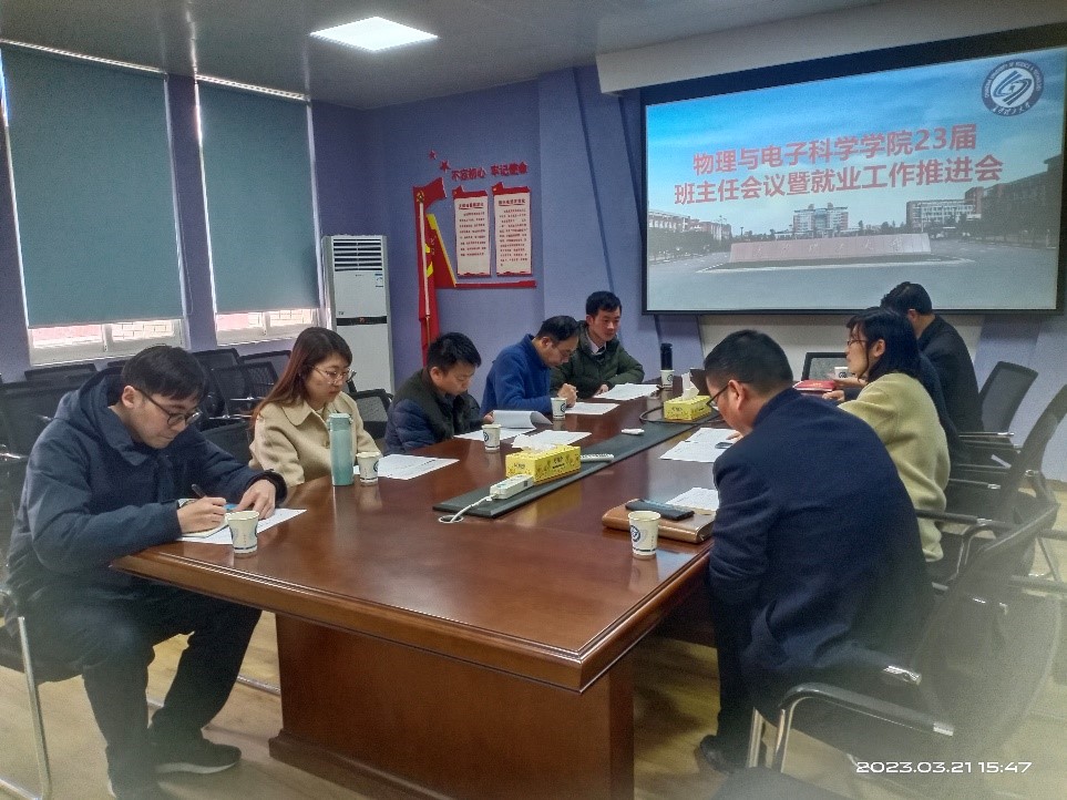 3月21日下午,物理与电子科学学院本科毕业年级班主任工作会议暨就业工作推进会在理科楼C511会议室举行。物电学院党委书记张国强、党委副书记宋国宁、本科毕业年级班主任参与会议。