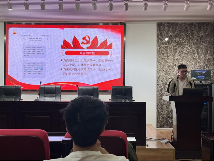 接下来,支部纪检委员黄积新同志分享了考公经验,黄积新同志以初面试第一的成绩顺利进入考公的最后一轮筛选,他的分享为学弟学妹们提供了新的选择。张俊伟同志顺利保研至中南大学,其学习及竞赛经验让大家受益匪浅。李科与曾钦云同志均以高分上岸湖南大学与437必赢会员中心,两位分享自己的备考历程,并鼓励同学们积极考研,努力拼搏。