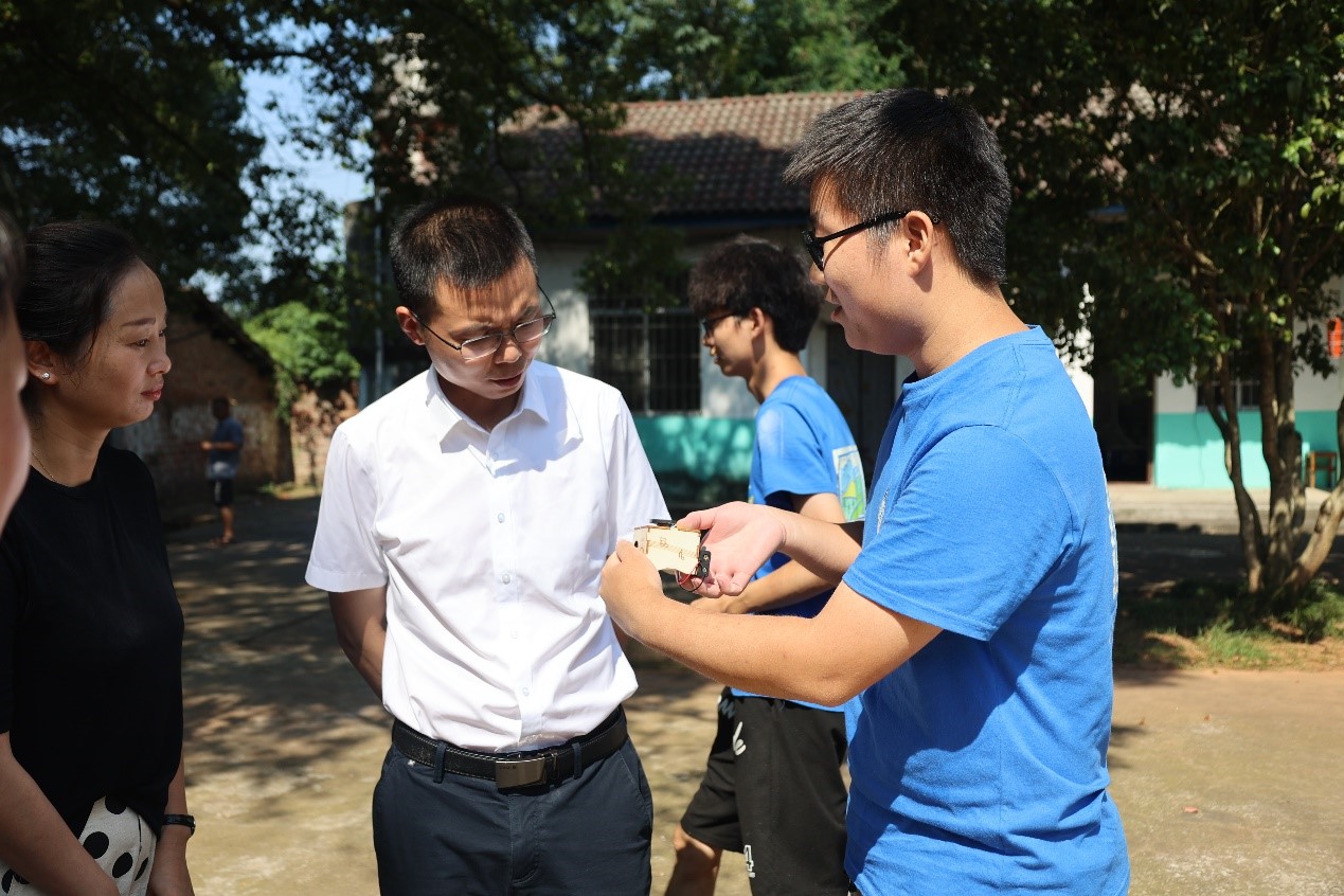 紧接着,领导们移步展示区域,支教队员向各位领导介绍本次创造营所教授的一些作品。绘画、手工制作、物理实验装置等一系列作品展现了同学们的创意和努力。色彩斑斓的画作、巧夺天工的手工制品、充满创意的物理实验装置,让人赞叹不已。