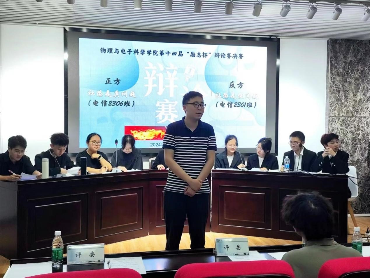 2024 年 5 月 10 日,物电学院第十四届“励志杯”新生辩论赛决赛完美收官。此次辩论赛的辩题为“社恐是否是个真问题”,双方辩手就此展开激烈讨论。参加此次辩论赛的评委有孙文超学长、朱妍洁学姐、石子涵学长,同时姚巍老师作为嘉宾出席活动,并预祝辩论赛顺利进行。