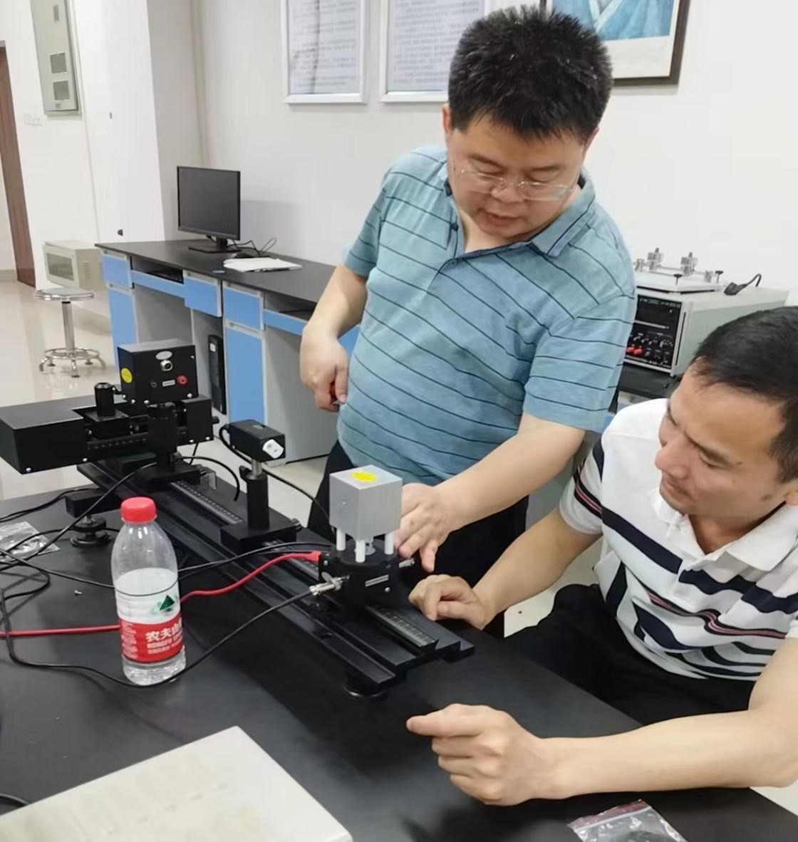 图7 公司总经理王华和实践团指导老师唐清善对组装完成后的红外热成像装置进行调试