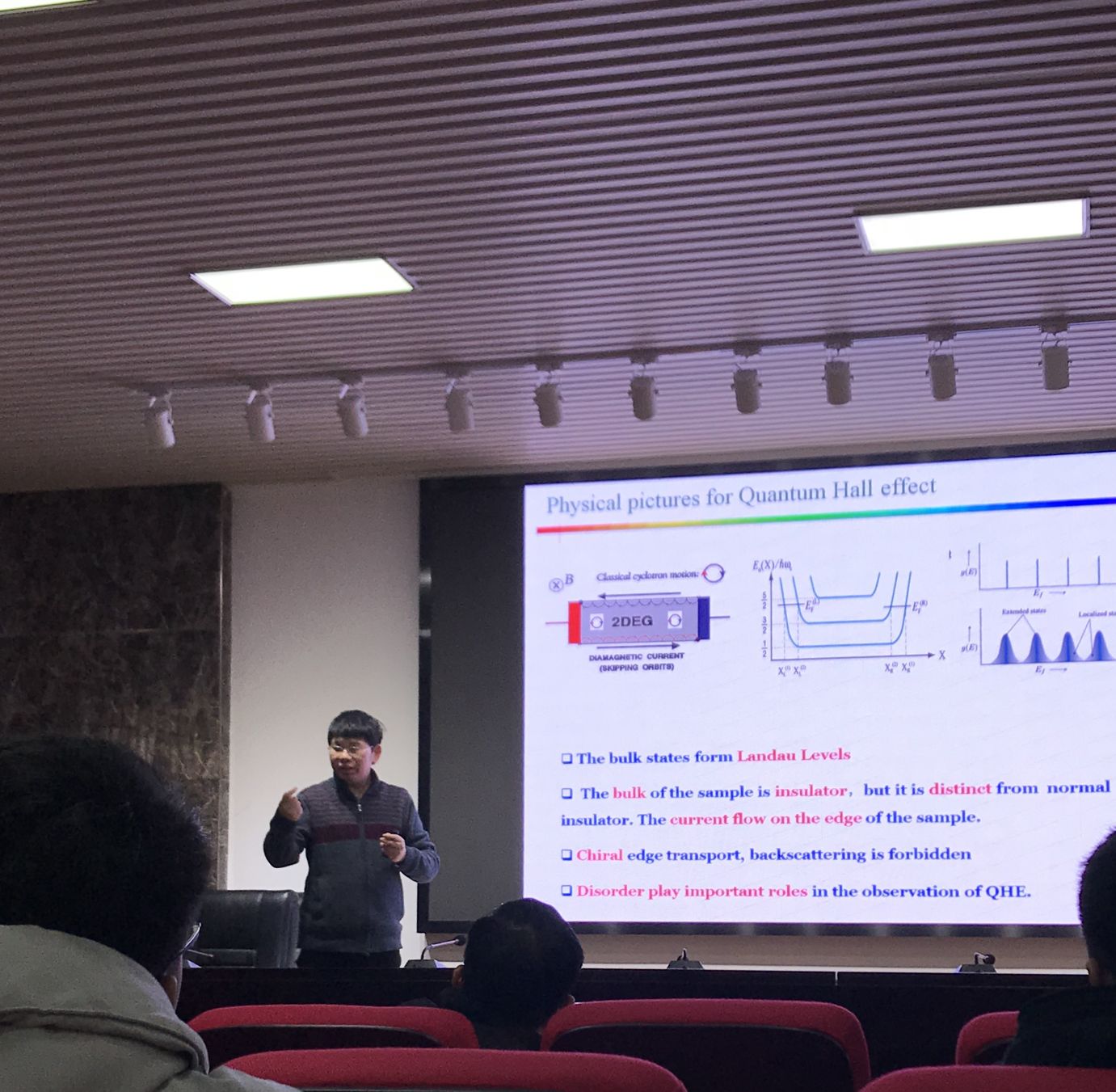 报告会上,江华教授首先祝同学们新年快乐,随之抛出“为什么一定强度下的磁场条件下能够产生电子效应”这一问题开始了他的讲座。江教授在简单介绍了近年来拓扑态无序效应方向的研究成果之后,分析了弱无序、中等无序及强无序等三种无序状态下拓扑态的变化与差异。最后,江教授介绍了拓扑无序研究趋势供与会者思考。报告会后,老师和同学们争相提问,江教授都一一作出了回答。本次报告会内容丰富,针对性强,给同学们留下了深刻的印象。