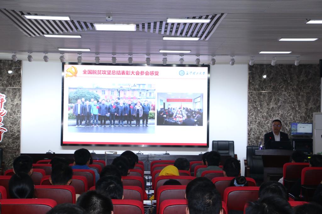 宋刘斌老师以“把驻村积累的精神财富化作奋发前行的动力”为题,分享了自己在全国脱贫攻坚表彰大会上的感受以及在枧甘村扶贫的经历。从成立党员志愿服务队,修建贵王桥和5组通护路,到投入资金建设易地扶贫搬迁安置点、动员全校师生“带货”帮售农产品……鲜活的案例、生动的图片让在场的同学仿佛亲历了山村的蜕变,也深切领会了打赢脱贫攻坚战的重大意义,更对党的政策、国家制度的优越先进性有了深刻的理解和认识。最后,宋老师寄语全体研究生:“希望同学们能够在艰苦奋斗中坚定理想信念,在认真学习中练就过硬本领,在为民服务中发扬奉献精神,把科研论文写在祖国的大地上。”