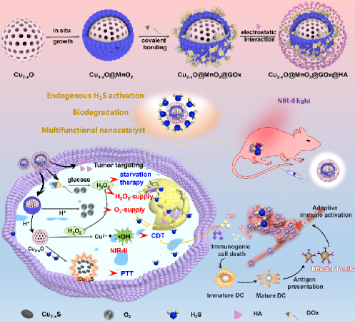 针对以上问题,研究人员发展了一种NIR-II光/肿瘤微环境双响应Cu2-xO@MnO2@GOx@HA级联催化纳米酶。首先利用HA的靶向特性增强纳米材料在肿瘤部位的积累;进一步,GOx通过消耗肿瘤部位的葡萄糖,实现饥饿治疗肿瘤的同时产生H2O2;利用产生的H2O2和MnO2反应产生•OH 治疗肿瘤,同时产生氧气,解决了深组织肿瘤的乏氧问题;最终,Cu2-xO和肿瘤内源性H2S反应生成Cu2-xS,在NIR-II光照下,实现了肿瘤的高效光热治疗。该研究为设计具有多种酶活性的多功能级联纳米酶协同增强癌症治疗提供了新的思路。