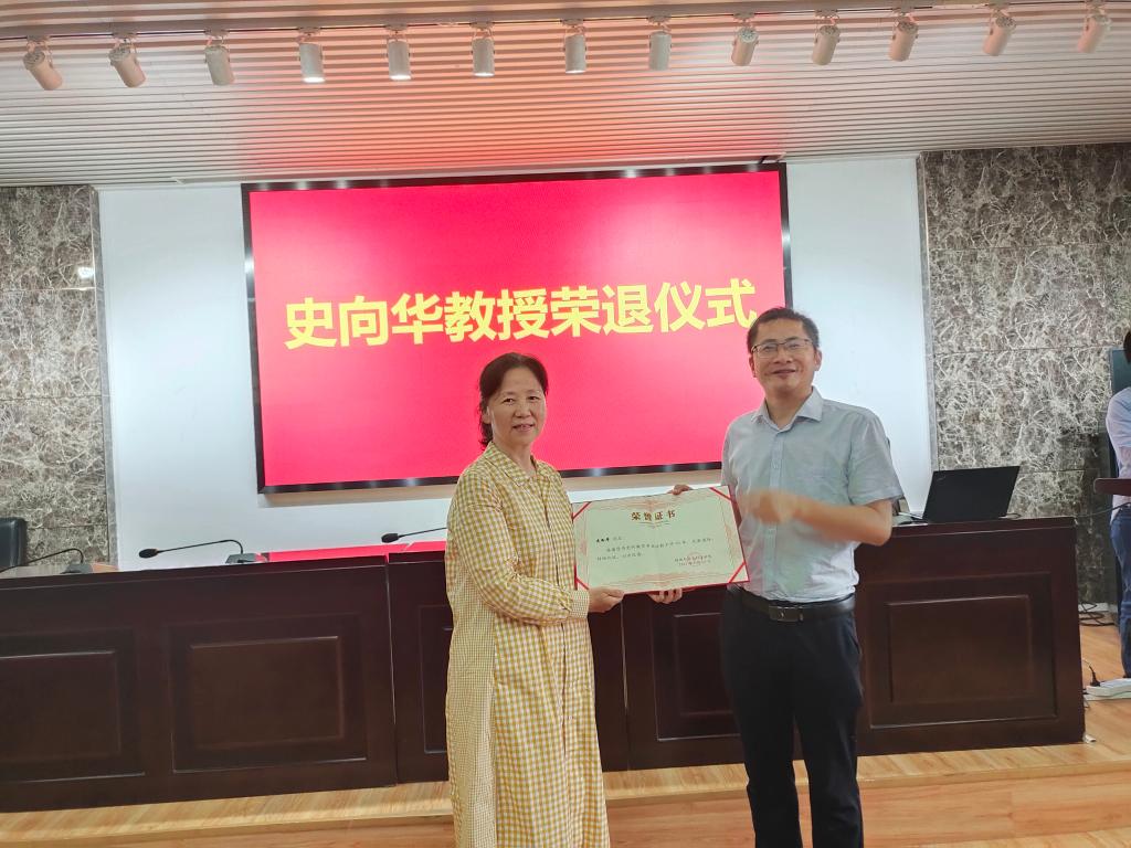 副院长(主持工作)张卫兵为史向华教授颁发了荣退证书,他对史教授为学院人才培养,青年教师传帮带等作出的贡献表示钦佩,祝福史老师退休生活丰富多彩。学院副院长范志强代表学院全体教师向史向华教授献上鲜花和贺卡。